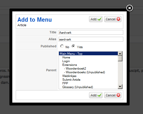 Add to Menu (http://www.nonumber.nl/extensions/addtomenu) – Z całą pewnością ten dodatek ucieszy wszystkich użytkowników panelu administracyjnego Joomla! 1.5, ponieważ dodaje on funkcje, która występowała w poprzedniej wersji CMS-a (1.0.x). Po kliknięciu na przycisk Zachowaj lub Zapisz podczas pracy nad artykułami dostaniesz przycisk, który umożliwia przypisanie artykułu do wybranej pozycji menu (zobacz rysunek poniżej wprost z nonumber.nl).